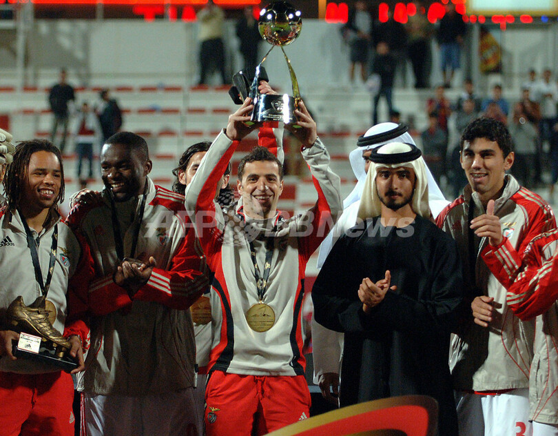 【ドバイ/UAE 10日 AFP】サッカー、モハメッド・ビン・ラーシド・アル・マクトゥーム国際サッカー選手権(Mohammad bin Rashid Al Maktoum International Football Championship)・決勝、ラツィオ(SS Lazio)vsベンフィカ(Benfica)。試合は0-0で迎えたPK戦の末ベンフィカが5-4で勝利を収め、優勝を果たした。写真は、トロフィーを掲げるベンフィカの主将シモン・サブロサ(Simao Sabrosa、左)。(c)AFP/KAMAL MOGHRABI