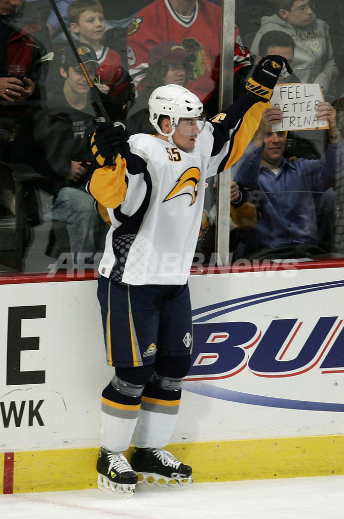 【シカゴ/米国 10日 AFP】06-07NHL、シカゴ・ブラックホークス(Chicago Blackhawks)vsバッファロー・セイバーズ(Buffalo Sabres)。セイバーズのヨケン・ヘクト(Jochen Hecht)は、第1ピリオド4分47秒に先制点を挙げ喜びを表す。試合は東カンファレンス北東部地区首位のセイバーズが2-1で接戦を制し、今季31勝目を挙げた。(c)AFP/Getty Images Jonathan Daniel