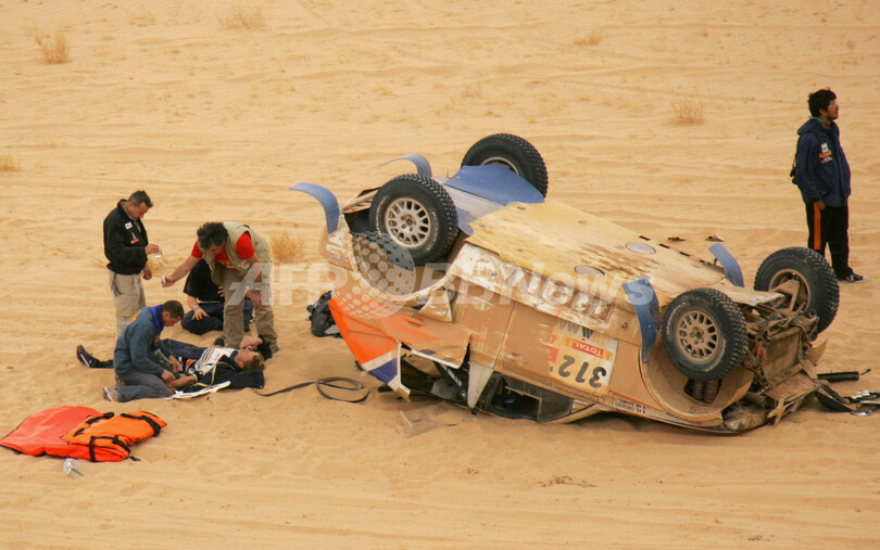 【ズエラット/モーリタニア 11日 AFP】ダカールラリー2007(Dakar rally 2007)、四輪部門・第6ステージ(タンタンからズエラット、競走区間394キロメートル/総距離817キロメートル)。総合6位からスタートしたBMWのゲラン・シシェル(Guerlain Chicherit、フランス)は、195キロメートル地点を通過後にクラッシュし途中棄権に終わった。(c)AFP/DAMIEN MEYER