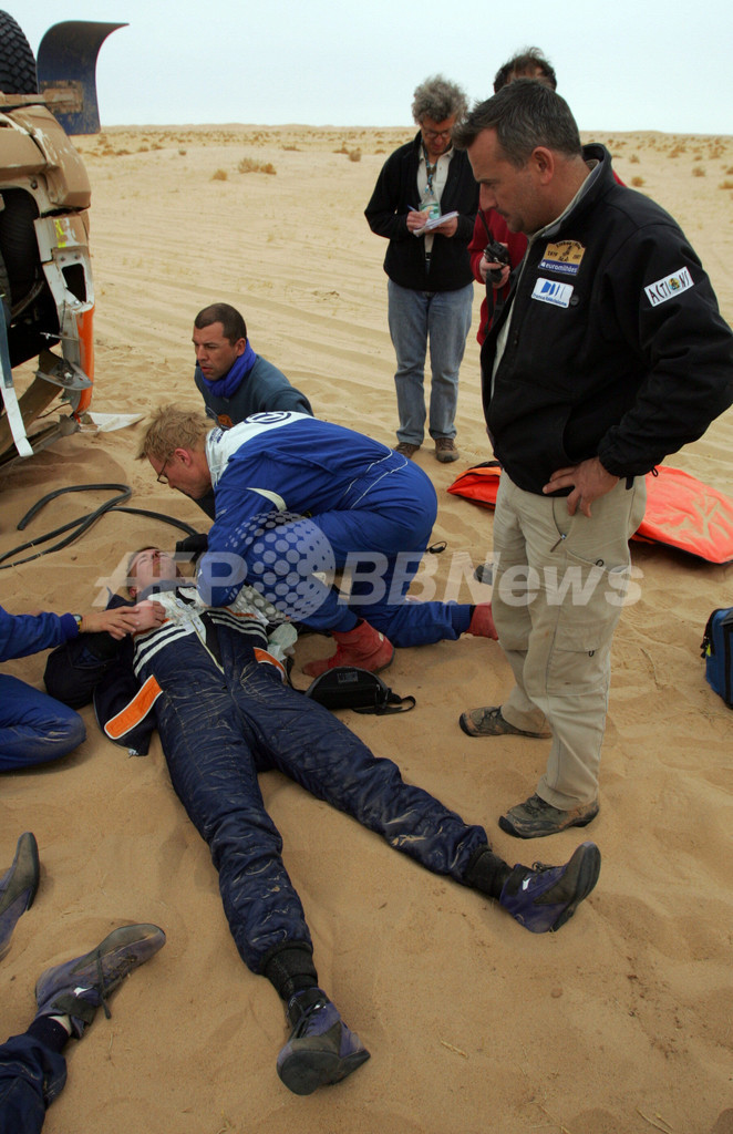 【ズエラット/モーリタニア 11日 AFP】ダカールラリー2007(Dakar rally 2007)、四輪部門・第6ステージ(タンタンからズエラット、競走区間394キロメートル/総距離817キロメートル)。総合6位からスタートしたBMWのゲラン・シシェル(Guerlain Chicherit、フランス)は、195キロメートル地点を通過後にクラッシュし途中棄権に終わった。(c)AFP/DAMIEN MEYER