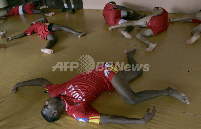 【シウダード・デル・エステ/パラグアイ 11日 AFP】サッカー、南米ユース選手権(2007 South American Youth Championship)・グループBに所属し初戦のアルゼンチン戦を勝利で飾ったコロンビアの選手たちは、13日のウルグアイ戦に向け調整練習を行った。写真は、ストレッチを行うカルロス・クインテーロ(Carlos Quintero)。(c)AFP/Juan MABROMATA