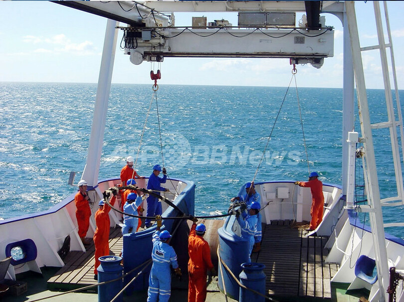 【台湾 12日 AFP】2006年12月26日に台湾南部で発生したマグニチュード7.1の地震により損傷した海底ケーブルの修復作業が進められている。ハイテク技術の発達したアジアだが、この21世紀ならではのトラブルへの対処方法は、実に19世紀的だ。船に乗った作業員が現地に赴き、長いロープの先に引っかけ錨をつけて海底を探り、損傷したケーブルを引き上げるのである。写真は、台湾南部の沖合で修復作業を終えてロープを引き上げる作業員。(c)AFP