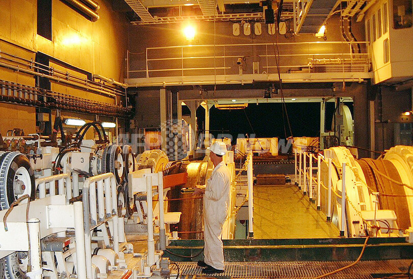 【台湾 12日 AFP】2006年12月26日に台湾南部で発生したマグニチュード7.1の地震により損傷した海底ケーブルの修復作業が進められている。ハイテク技術の発達したアジアだが、この21世紀ならではのトラブルへの対処方法は、実に19世紀的だ。船に乗った作業員が現地に赴き、長いロープの先に引っかけ錨をつけて海底を探り、損傷したケーブルを引き上げるのである。写真は、台湾南部の沖合で修復作業を終えてロープを引き上げる作業員。(c)AFP