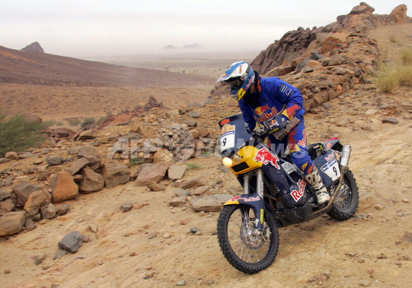 【アタール/モーリタニア 12日 AFP】ダカールラリー2007(Dakar rally 2007)、二輪部門・第7ステージ(ズエラットからアタール)、競争区間542キロメートル/総距離580キロメートル)。総合5位からスタートしたKTMのシリル・デプレ(Cyril Despres、フランス)は、4時間30分42秒でステージ優勝を飾り、通算22時間23分30秒で総合順位を1つ上げ4位につけた。(c)AFP/DAMIEN MEYER