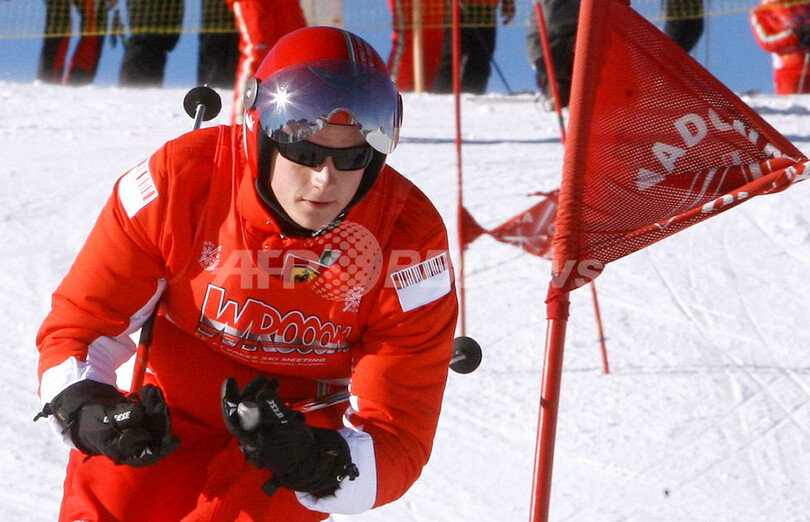 【マドンナ・ディ・カンピリオ/イタリア 12日 AFP】F1、フェラーリ(Ferrari)主催のスキー・イベント「16 WROOOM F1」に参加しているキミ・ライコネン(Kimi Raikkonen、中)は、この日行われた大回転のレースに参加した。写真は、チームメイトのフェリペ・マッサ(Felipe Massa、左)、ルカ・バドエル(Luca Badoer)とポーズをとるライコネン。(c)AFP/VINCENZO PINTO