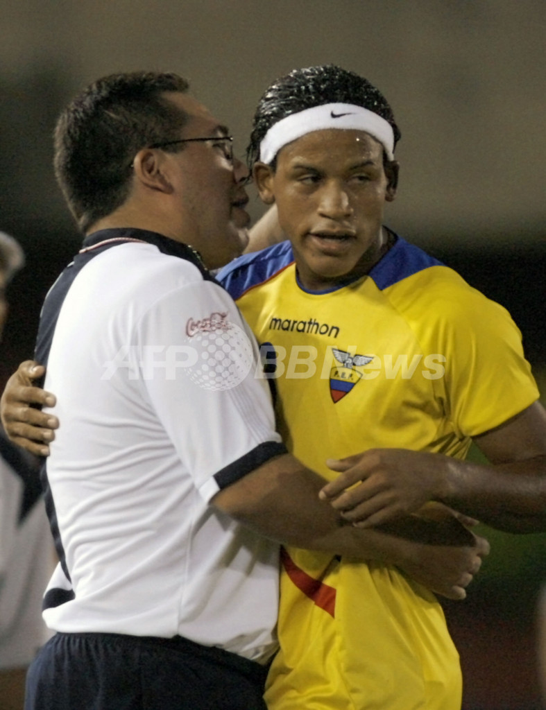 【シウダード・デル・エステ/パラグアイ 12日 AFP】サッカー、南米ユース選手権(2007 South American Youth Championship)・グループB、ベネズエラvsエクアドル。後半25分から出場したエクアドルのマイケル・アローヨ(Michael Arroyo、右)は、後半32分にPKから得点を決めてチームの勝利に貢献。試合はエクアドルが3-1でベネズエラに勝利し、今大会初勝利を挙げた。写真は得点後、イヴァン・ロメロ監督(Ivan Romero)と共に歓喜するアローヨ。(c)AFP/Juan MABROMATA