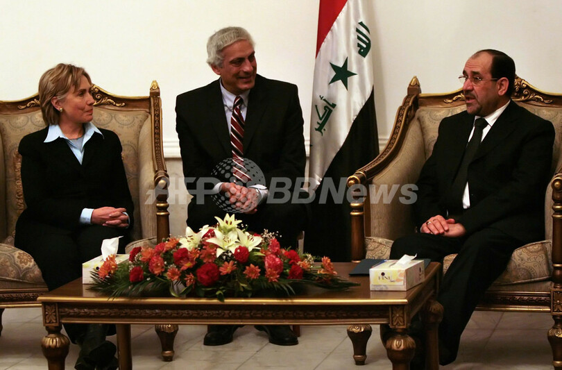 【バグダッド/イラク 14日 AFP】民主党のヒラリー・クリントン(Hillary Clinton)上院議員(ニューヨーク州選出)は13日、イラクと米軍の指導者らと会談するため、民主党のエバン・バイ(Evan Bayh)上院議員と共和党のジョン・マクヒュー(John McHugh)下院議員とともにバグダッドを訪れた。米国大使館の関係者がAFPに伝えた。クリントン議員は、当初イラク戦争を支持していたが、現在は厳しく戦争を批判している。写真はヌーリ・マリキ(Nuri al-Maliki)首相と会談するクリントン議員。(c)AFP/ALI AL-SAADI