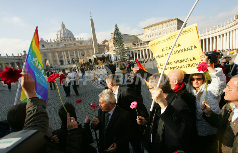【バチカン 13日 AFP】バチカンのサンピエトロ広場で13日、イタリア市民らは、ローマ法王ベネディクト16世(Benedict XVI)の同性愛カップルの法的地位を認める法案反対の発言に抗議し、デモを行った。イタリア政府は未婚の同性愛カップルの法的地位を認めるシビルユニオン法の準備を進めているが、ローマ法王ベネディクト16世(Benedict XVI)は11日、これに対する反対の意を改めて強調していた。写真は13日、サンピエトロ広場で抗議のデモを行う人々。(c)AFP