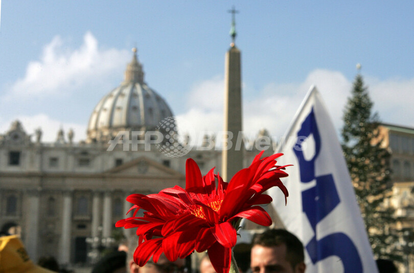 【バチカン 13日 AFP】バチカンのサンピエトロ広場で13日、イタリア市民らは、ローマ法王ベネディクト16世(Benedict XVI)の同性愛カップルの法的地位を認める法案反対の発言に抗議し、デモを行った。イタリア政府は未婚の同性愛カップルの法的地位を認めるシビルユニオン法の準備を進めているが、ローマ法王ベネディクト16世(Benedict XVI)は11日、これに対する反対の意を改めて強調していた。写真は13日、サンピエトロ広場で抗議のデモを行う人々。(c)AFP
