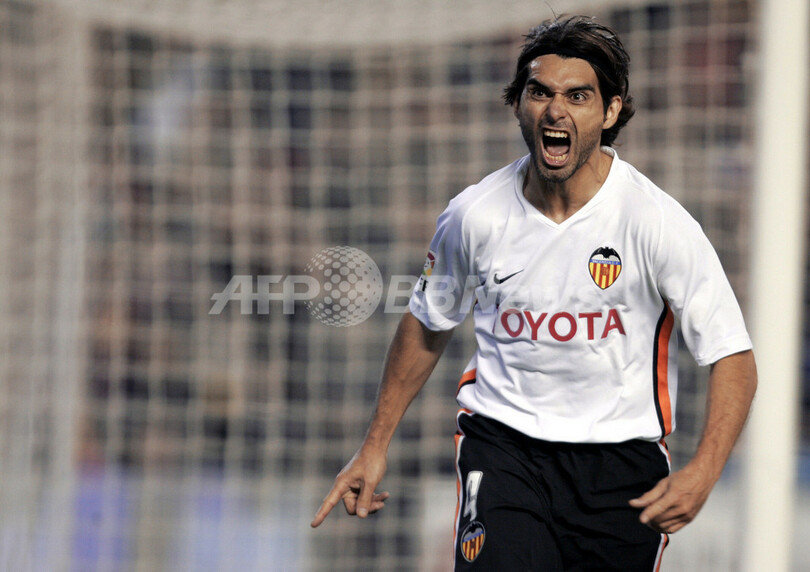 【バレンシア/スペイン 13日 AFP】サッカー、スペイン・リーガエスパニョーラ1部・第18節、バレンシア(Valencia)vsレバンテ(Levante)。バレンシアのロベルト・アジャラ(Roberto Ayala)は、後半34分にチーム3点目となるゴールを決める。試合はバレンシアが3-0でレバンテに快勝し5連勝を飾り勝ち点を33に伸ばした。写真は、ゴールを決め喜びを爆発させるアジャラ。(c)AFP/JOSE JORDAN
