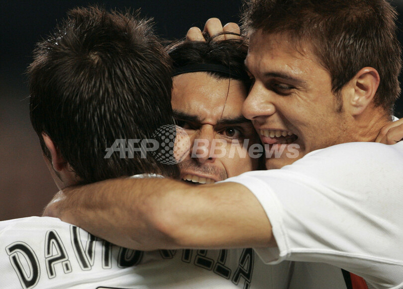 【バレンシア/スペイン 13日 AFP】サッカー、スペイン・リーガエスパニョーラ1部・第18節、バレンシア(Valencia)vsレバンテ(Levante)。バレンシアのロベルト・アジャラ(Roberto Ayala)は、後半34分にチーム3点目となるゴールを決める。試合はバレンシアが3-0でレバンテに快勝し5連勝を飾り勝ち点を33に伸ばした。写真は、ゴールを決め喜びを爆発させるアジャラ。(c)AFP/JOSE JORDAN
