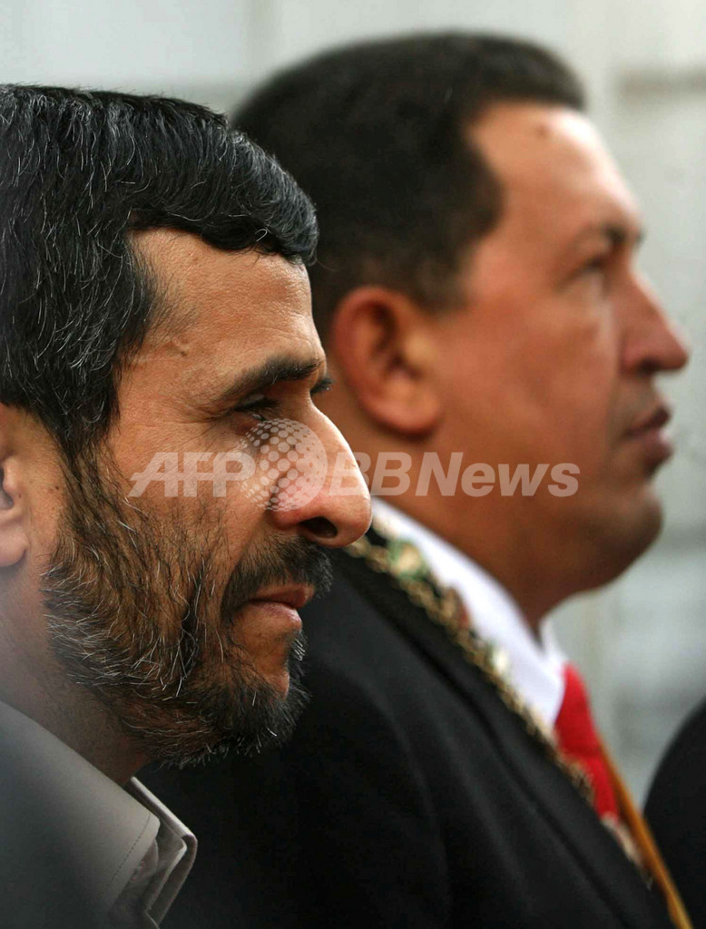 【カラカス/ベネズエラ 14日 AFP】イランのマフムード・アフマディネジャド(Mahmoud Ahmadinejad)大統領は14日、カラカス(Caracas)を訪問した。アフマディネジャド大統領はウゴ・チャベス(Hugo Chavez)大統領と会談し、両国の戦略的協調関係の一環としていくつかの2国間協定を調印する予定である。国営イラン通信(IRNA)によれば、アフマディネジャド大統領は「イランとベネズエラは重要な同盟関係にある。両国は重要な産業、産油プロジェクトを有しており、今回の訪問はこれをさらに推し進めるものである」と述べた。写真はアフマディネジャド大統領(右)を歓迎するチャベス大統領(左)。(c)AFP/Marcelo Garcia - Presidencia