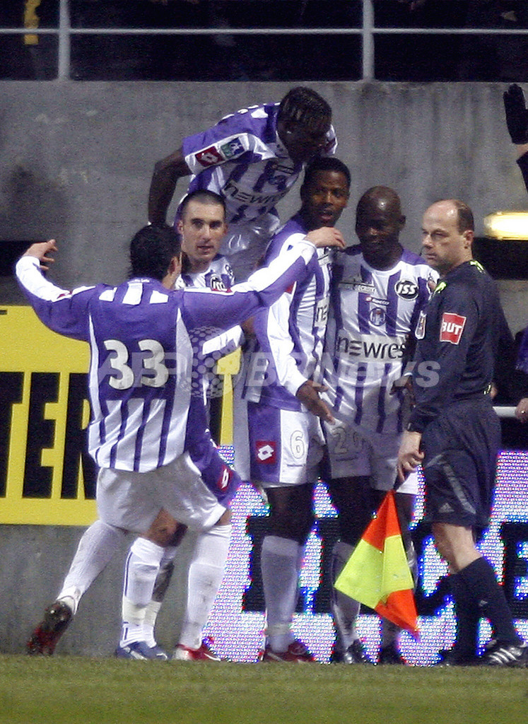 【トゥールーズ/フランス 13日 AFP】サッカー、フランス・リーグ1・第20節、トゥールーズ(Toulouse FC)vsオリンピック・リヨン(Olympique Lyon)。トゥールーズのシル・エマナ(Achille Emana)は、後半18分に先制点となるゴールを決めチームの勝利に貢献した。試合はトゥールーズが2-0でリヨンを降し連敗を3で止めた。また敗れたリヨンはシーズン2敗目を喫した。写真は、チームメートに祝福されるトゥールーズのエマナ(右2)。(c)AFP/PASCAL PAVANI