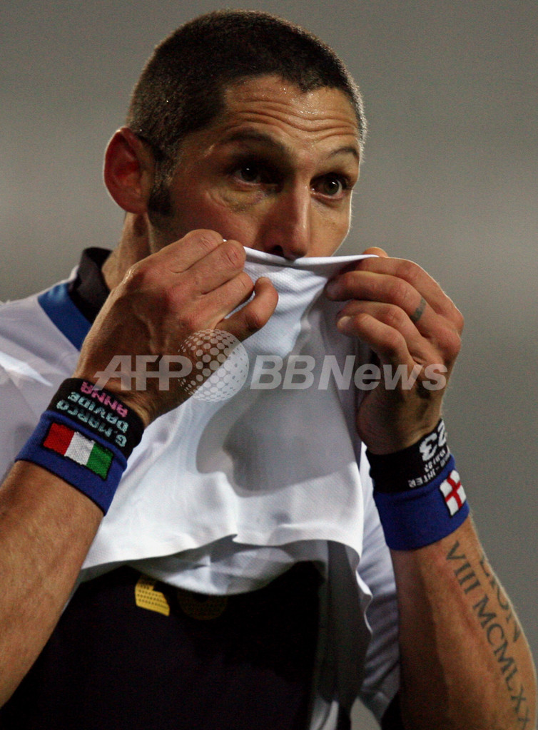 【トリノ/イタリア 13日 AFP】サッカー、イタリア・セリエA・19節、トリノ(Torino FC)vsインテル(Inter Milan)。インテルのマルコ・マテラッツィ(Marco Materazzi)は、後半40分にチーム3点目となるPKを決めてチームの勝利に貢献した。試合はインテルが3-1でトリノを降し12連勝を飾り、2005-06シーズンにローマ(AS Roma)が打ち立てたセリエAの最多連勝記録を更新した。写真は、PKを決めてアピールをするマテラッツィ。(c)AFP/Paco SERINELLI