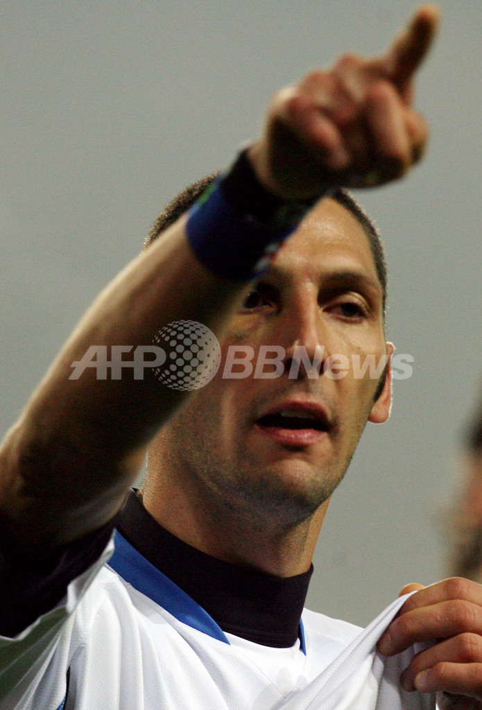 【トリノ/イタリア 13日 AFP】サッカー、イタリア・セリエA・19節、トリノ(Torino FC)vsインテル(Inter Milan)。インテルのマルコ・マテラッツィ(Marco Materazzi)は、後半40分にチーム3点目となるPKを決めてチームの勝利に貢献した。試合はインテルが3-1でトリノを降し12連勝を飾り、2005-06シーズンにローマ(AS Roma)が打ち立てたセリエAの最多連勝記録を更新した。写真は、PKを決めてアピールをするマテラッツィ。(c)AFP/Paco SERINELLI