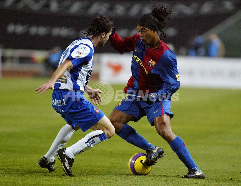 【バルセロナ/スペイン 13日 AFP】サッカー、スペイン・リーガエスパニョーラ1部・第18節、エスパニョール(Espanyol)vsバルセロナ(Barcelona)。試合はバルセロナが終始ボールを支配するも1-3でエスパニョールに敗れ、リーグ2敗目を喫した。写真は、エスパニョールのフアン・ベラスコ(Juan Velasco、左)をかわそうとするバルセロナのロナウジーニョ(Ronaldinho)。(c)AFP/CESAR RANGEL