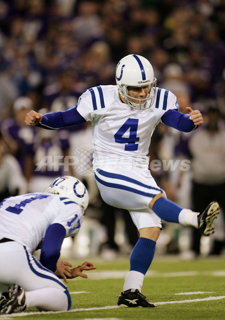 【ボルティモア/米国 13日 AFP】NFL・プレーオフAFC準決勝、ボルティモア・レイヴンズ(Baltimore Ravens)vsインディアナポリス・コルツ(Indianapolis Colts)。コルツのキッカー、アダム・ヴィナティエリ(Adam Vinatieri)は、最長51ヤードを含む5本中5本のフィールドゴールを成功させ、チームの全得点を叩き出す活躍で勝利に貢献した。試合は終始先手を取り続けたコルツが15-6でレイヴンズを降し、プレーオフ決勝に駒を進めた。コルツはAFC決勝でサンディエゴ・チャージャース(San Diego Chargers)とニューイングランド・ペイトリオッツ(New England Patriots)の勝者と対戦する。写真は、第4QにFGを蹴るコルツのヴィナティエリ。(c)AFP/Getty Images Chris McGrath