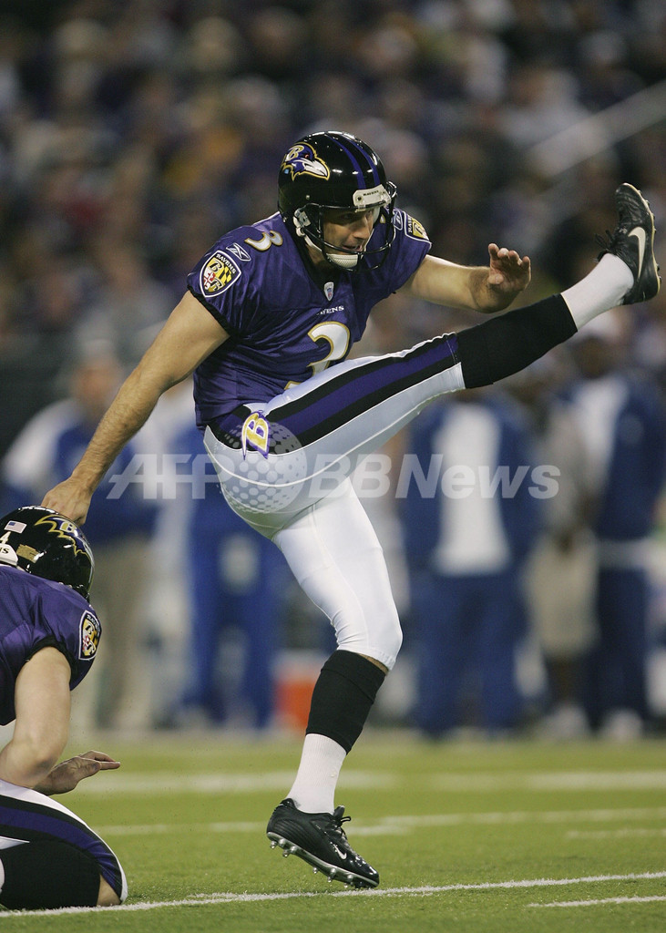 【ボルティモア/米国 13日 AFP】NFL・プレーオフAFC準決勝、ボルティモア・レイヴンズ(Baltimore Ravens)vsインディアナポリス・コルツ(Indianapolis Colts)。コルツのキッカー、アダム・ヴィナティエリ(Adam Vinatieri)は、最長51ヤードを含む5本中5本のフィールドゴールを成功させ、チームの全得点を叩き出す活躍で勝利に貢献した。試合は終始先手を取り続けたコルツが15-6でレイヴンズを降し、プレーオフ決勝に駒を進めた。コルツはAFC決勝でサンディエゴ・チャージャース(San Diego Chargers)とニューイングランド・ペイトリオッツ(New England Patriots)の勝者と対戦する。写真は、第4QにFGを蹴るコルツのヴィナティエリ。(c)AFP/Getty Images Chris McGrath