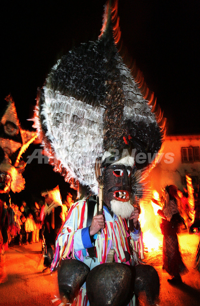 【ソフィア/ブルガリア 14日 AFP】ソフィア(Sofia)から南西へ約50キロメートルのGabrov Dol村で13日、Kukeri Carnivalと呼ばれるお祭りが開催されている。お祭りでは、ビーズやリボン、毛糸の房などで装飾された、色とりどりの手作りのマスクや衣装を着た人々が春の訪れを祝う。祭の主役が振り回す重そうな衣装は、大量の小麦を表し、豊作の願いが込められている。腰に巻かれた鈴は、災厄や病気を振り払うという意味がある。写真は同日、Gabrov Dol村で儀式の踊りを踊る人々。(c)AFP/BORYANA KATSAROVA