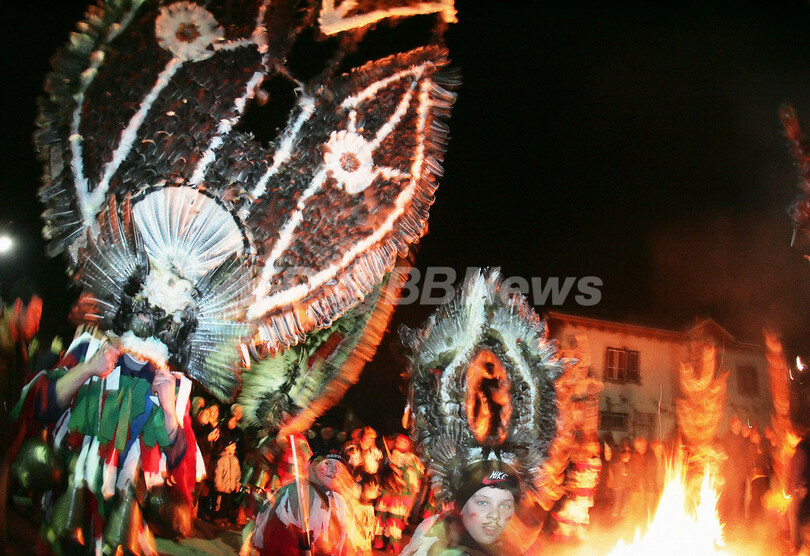 【ソフィア/ブルガリア 14日 AFP】ソフィア(Sofia)から南西へ約50キロメートルのGabrov Dol村で13日、Kukeri Carnivalと呼ばれるお祭りが開催されている。お祭りでは、ビーズやリボン、毛糸の房などで装飾された、色とりどりの手作りのマスクや衣装を着た人々が春の訪れを祝う。祭の主役が振り回す重そうな衣装は、大量の小麦を表し、豊作の願いが込められている。腰に巻かれた鈴は、災厄や病気を振り払うという意味がある。写真は同日、Gabrov Dol村で儀式の踊りを踊る人々。(c)AFP/BORYANA KATSAROVA