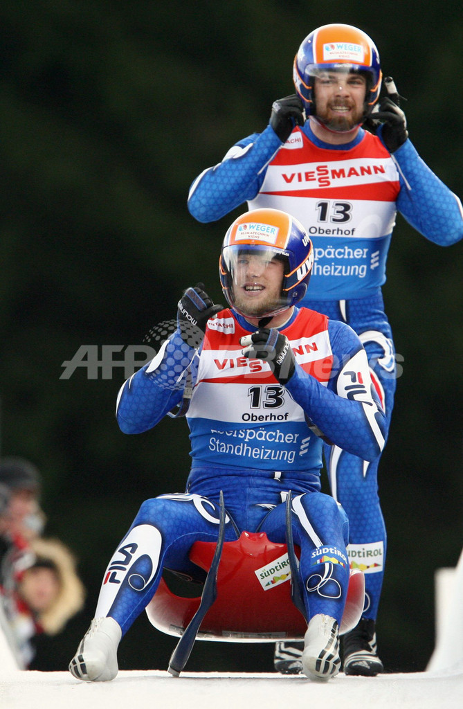 【オーバーホーフ/ドイツ 14日 AFP】リュージュW杯(FIL Luge World Cup)・第6戦、男子・二人乗り。イタリアのクリスチャン・オーベルシュトルツ(Christian Oberstolz)/パトリック・グルーバー(Patrick Gruber)組は、1本目43秒813、2本目43秒560をマークし合計1分27秒373で優勝を果たし、今季3勝目を挙げた。(c)AFP/JENS-ULRICH KOCH