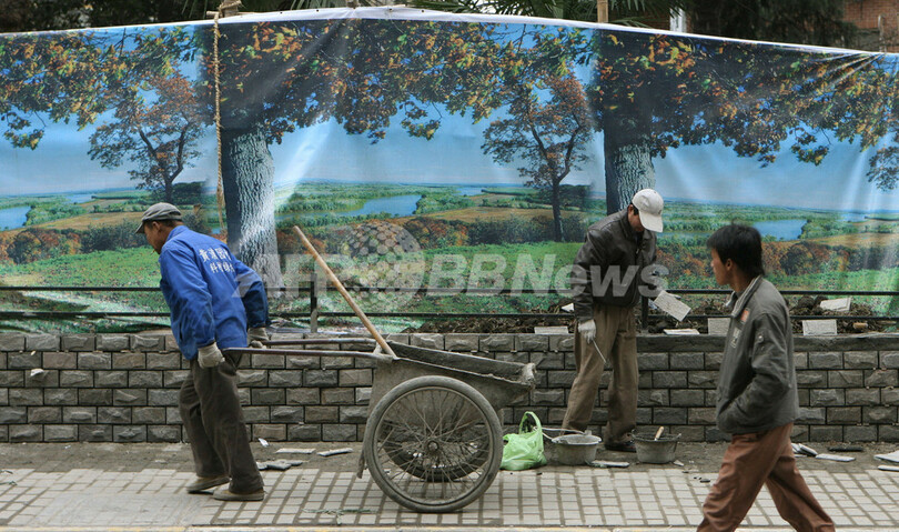 【上海/中国 14日 AFP】好景気に沸く中国株式市場は時価総額で約1兆ドル(約120兆円)に上る。1日の売買高は約90億ドル(約1兆800億円)付近で推移し、東京市場を見据える水準だ。国営企業株の大幅な規定見直しを市場が好感したことから始まった過去最高の好況は、中国経済を世界第3位に押し上げている機械生産および輸出によって支えられているとアナリストらは分析する。写真は14日、上海の建設現場に張られた幕の前を通る人々。(c)AFP/Mark RALSTON