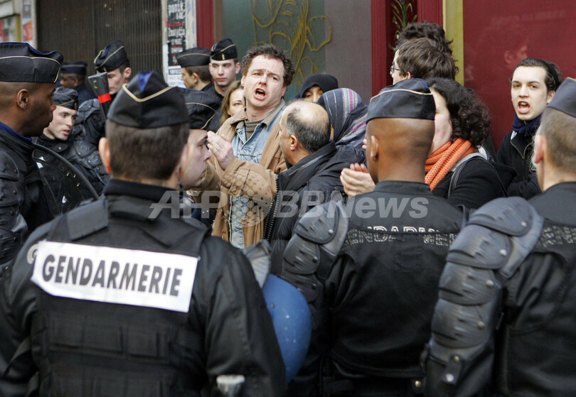 【パリ/フランス 14日 AFP】パリのニコラ・サルコジ(Nicolas Sarkozy)内相の事務所に14日、20人ほどの不法移民がデモと称して侵入した。「不法移民や移民一般に対する抑圧と強制捜査を認めるの政策を非難するための占拠だ」として、4月に予定されている大統領選挙の選挙戦では不法移民の存在が大きく影響するだろうなどと述べた。サルコジ内相は同日、与党「国民連合運動(UMP)」の大統領候補に指名された。写真は、警官隊ともみあう不法移民ら。(c)AFP/JACQUES DEMARTHON