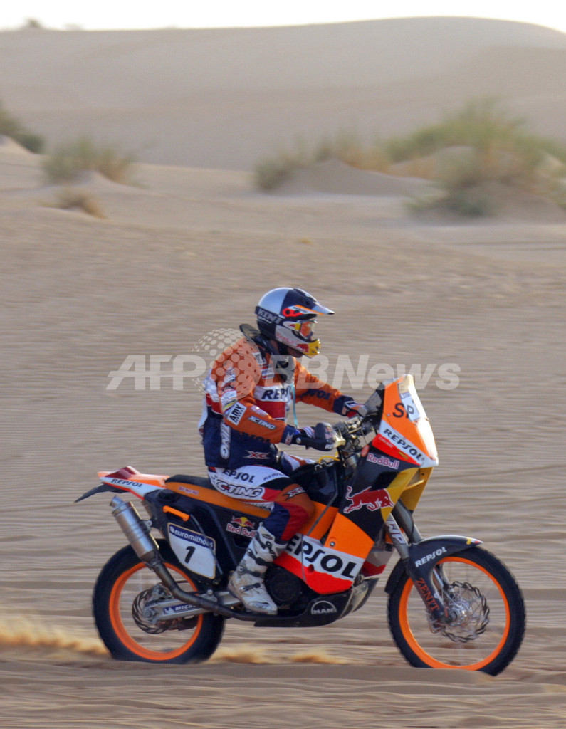 【ティシット/モーリタニア 14日 AFP】ダカールラリー2007(Dakar rally 2007)、二輪部門・第8ステージ(アタールからティシット)、競争区間589キロメートル/総距離626キロメートル)。総合首位からスタートしたKTMのマルク・コマ(Marc Coma、スペイン)は、7時間46分13秒で首位から12分22秒でステージ優勝を飾り、、通算30時間24分47秒で総合首位を守った。(c)AFP/DAMIEN MEYER