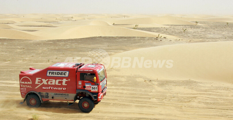 【ティシット/モーリタニア 14日 AFP】ダカールラリー2007(Dakar rally 2007)、トラック部門・第8ステージ(アタールからティシット、競走区間589キロメートル/総距離626キロメートル)。総合首位からスタートしたMANのハンス・ステイシー(Hans Stacey、オランダ)は、8時間58分49秒をマークしてステージ優勝を飾り、通算31時間35分46秒で総合首位をキープした。(c)AFP/DAMIEN MEYER