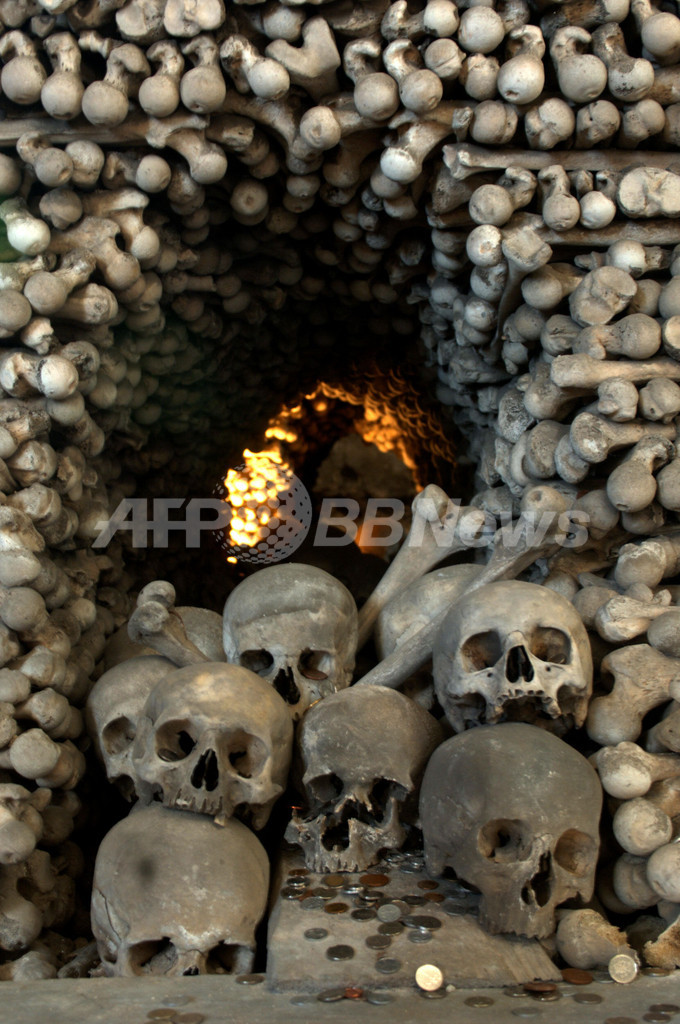 【セドレツ/チェコ 15日 AFP】プラハから東へ約75キロメートルのクトナー・ホラ(Kutna Hora)郊外のセドレツ(Sedlec)には、人骨でできた納骨堂がある。納骨堂はCemetery Church of All Saintsという教会の地下にあり、その歴史は14世紀にさかのぼるが、現在この納骨堂で見られる4万人分の骨は、18世紀からのものである。写真は14日、納骨堂内の人骨と供えられたコイン。(c)AFP/MICHAL CIZEK