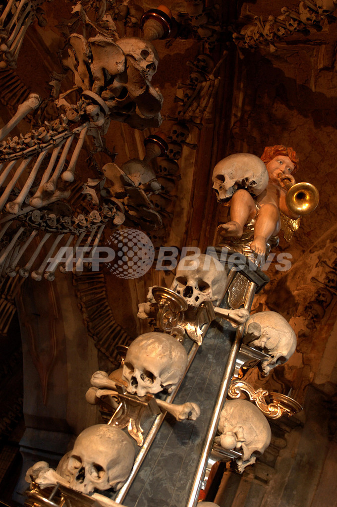 【セドレツ/チェコ 15日 AFP】プラハから東へ約75キロメートルのクトナー・ホラ(Kutna Hora)郊外のセドレツ(Sedlec)には、人骨でできた納骨堂がある。納骨堂はCemetery Church of All Saintsという教会の地下にあり、その歴史は14世紀にさかのぼるが、現在この納骨堂で見られる4万人分の骨は、18世紀からのものである。写真は14日、納骨堂内の人骨と供えられたコイン。(c)AFP/MICHAL CIZEK