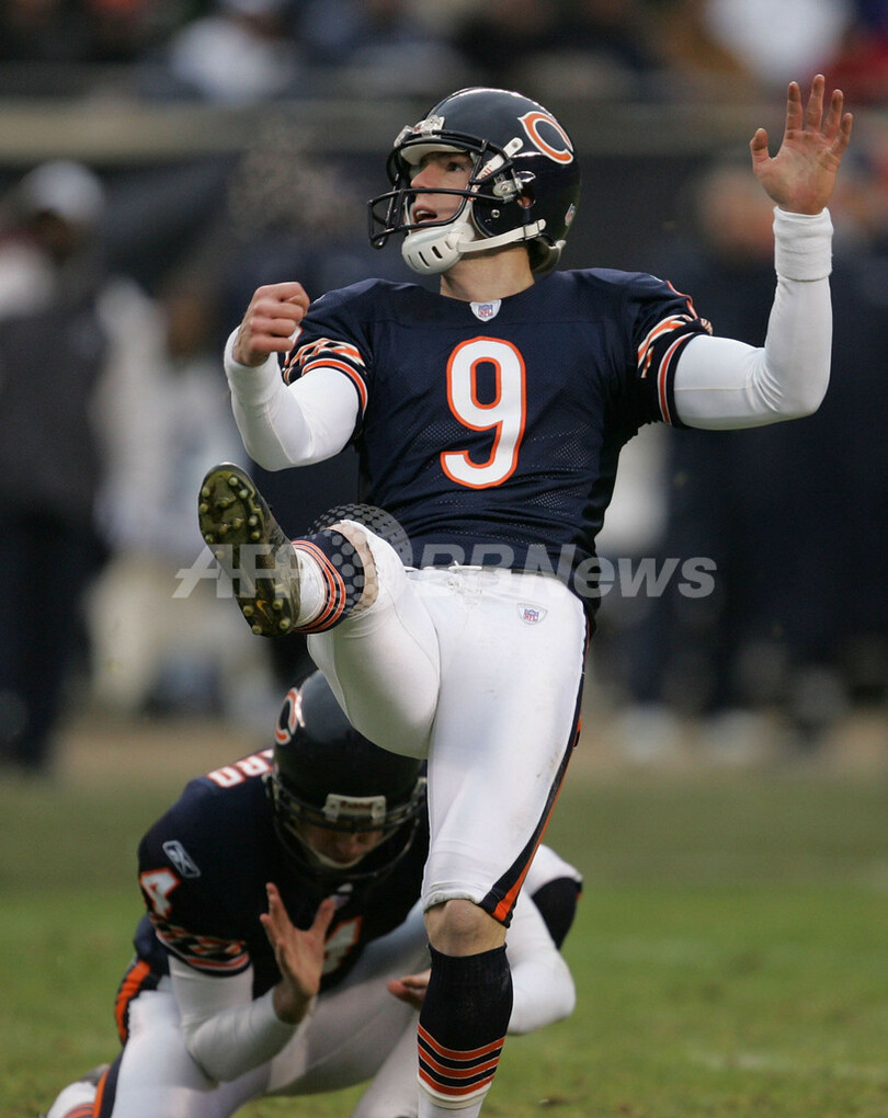 【シカゴ/米国 14日 AFP】NFL・プレーオフNFC準決勝、シカゴ・ベアーズ(Chicago Bears)vsシアトル・シーホークス(Seattle Seahawks)。ベアーズのキッカー、ロビー・ゴウルド(Robbie Gould)はオーバータイムに49ヤードフィールドゴールを決めるなど、2本中2本のフィールドゴールを決め9得点を記録しチームの勝利に貢献した。試合はベアーズがオーバータイムの末に27-24でシーホークスに勝利し、1988年以来となるNFC決勝進出を決めた。ベアーズはNFC決勝でニューオーリンズ・セインツ(New Orleans Saints)と対戦する。写真は、オーバータイムに決勝のフィールドゴールを決めるゴウルド(右)。(c)AFP/Getty Images Gregory Shamus