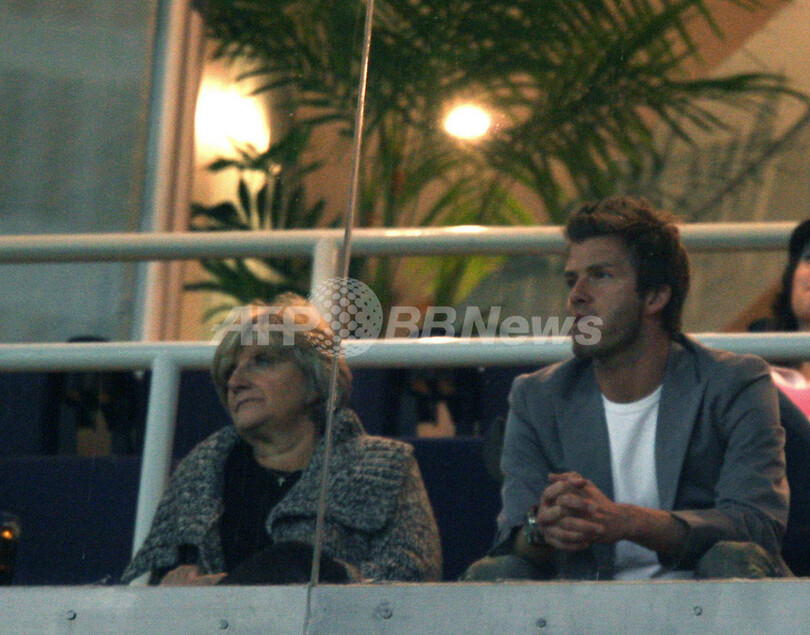 写真は、VIP席から試合を観戦するベッカム。(c)AFP/PHILIPPE DESMAZES