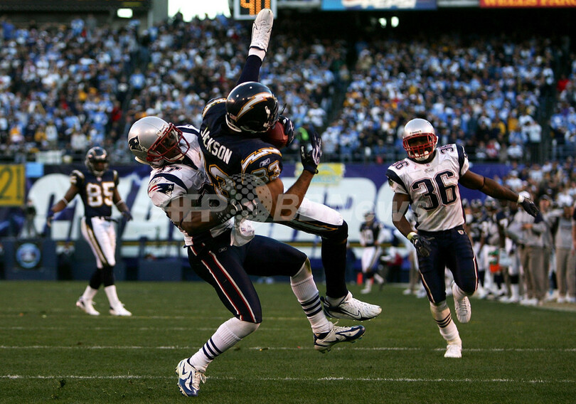 【サンディエゴ/米国 14日 AFP】NFL・プレーオフAFC準決勝、サンディエゴ・チャージャーズ(San Diego Chargers)vsニューイングランド・ペイトリオッツ(New England Patriots)。ペイトリオッツのキッカー、スティーヴン・ゴストコフスキー(Stephen Gostkowski)は、最長50ヤードを含む3本中3本のFGを成功させてチームの勝利に貢献した。試合は、チャージャーズが最大11点差を付けるも、ペイトリオッツが第4Q終盤に逆転して、24-21で勝利しプレーオフ決勝に駒を進めた。ペイトリオッツはAFC決勝でインディアナポリス・コルツ(Indianapolis Colts)と21日に対戦する。写真は、第3Qに34ヤードのFGを蹴るゴストフスキー。(c)AFP/Getty Images Stephen Dunn