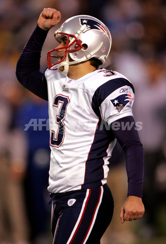 【サンディエゴ/米国 14日 AFP】NFL・プレーオフAFC準決勝、サンディエゴ・チャージャーズ(San Diego Chargers)vsニューイングランド・ペイトリオッツ(New England Patriots)。ペイトリオッツのキッカー、スティーヴン・ゴストコフスキー(Stephen Gostkowski)は、最長50ヤードを含む3本中3本のFGを成功させてチームの勝利に貢献した。試合は、チャージャーズが最大11点差を付けるも、ペイトリオッツが第4Q終盤に逆転して、24-21で勝利しプレーオフ決勝に駒を進めた。ペイトリオッツはAFC決勝でインディアナポリス・コルツ(Indianapolis Colts)と21日に対戦する。写真は、第3Qに34ヤードのFGを蹴るゴストフスキー。(c)AFP/Getty Images Stephen Dunn