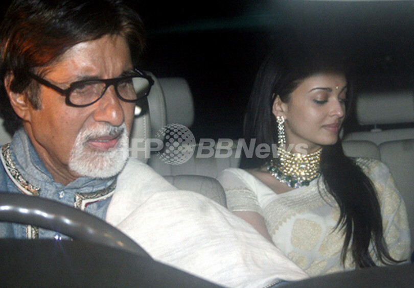 【ムンバイ/インド 16日 AFP】熱愛が報じられていた俳優のアビシェーク・バッチャン(Abhishek Bachchan)と人気女優、アイシュワリヤ・ライ(Aishwarya Rai)が14日、ムンバイのジュフ地区の海沿いにあるアビシェークの自宅で婚約したことが明らかになった。この婚約は後ほど、アビシェークの父でインドのハリウッド、ボリウッド(Bollywood)のトップスター、アミターブ・バッチャン(Amitabh Bachchan)により正式に認められ、インド映画界一のビッグカップルのめでたい報告にファンらは喜んだようだ。写真は15日、アミターブ・バッチャン(左)の運転する車の後部座席に乗るアイシュワリヤ・ライ。(c)AFP/STR