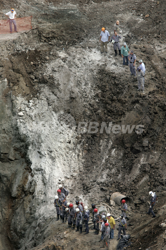【サンパウロ/ブラジル 16日 AFP】12日に大規模爆発があったサンパウロ(Sao Paulo)の地下鉄Pinheiros駅付近では、15日も救助活動のための掘削作業が行われた。爆発で陥落した穴には行方不明者7人が埋まっているもよう。穴のまわりは地滑りを起こし、付近に停めてあった車も穴に吸い込まれた。地下鉄線路の敷設作業員に物資を届けるために付近に停車していたミニバンは、40メートル下まで転落したという。写真は同日、陥没した穴の様子。(c)AFP/Mauricio LIMA