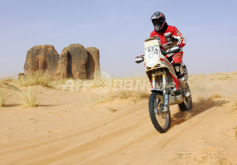 【ネマ/モーリタニア 15日 AFP】ダカールラリー2007(Dakar rally 2007)、二輪部門・第9ステージ(ティシットからネマ、競走区間494キロメートル/総距離497キロメートル)。総合14位からスタートしたKTMのヤニス・ビンターズ(Janis Vinters、ラトビア)は、は、6時間08分51秒でステージ優勝を飾り、3分のペナルティを含む合計タイム40時間12分04秒で総合8位に浮上した。(c)AFP/DAMIEN MEYER