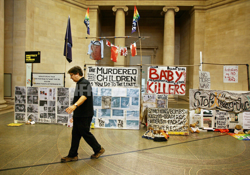 国会議事堂前の広場(Parliament Square)で仮設キャンプ生活をしながら反戦運動を行ってきた平和活動家、ブライアン・ホウ氏(Brian Haw)の筆跡をアート作品として甦らせた同展では、ホウ氏が集めてきた600点を超える雨風にさらされたプラカード、旗、写真や応援する人々から贈られた平和のメッセージが展示されている。