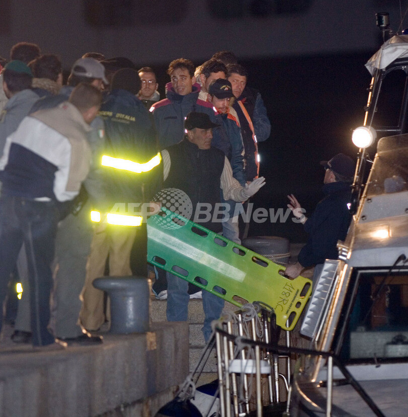 【レッジョディカラブリア/イタリア 16日 AFP】イタリア半島とシチリア島間の海上で15日、商船と水中翼型高速フェリーが衝突し、2人が死亡、数十人が負傷した。テレビ局「スカイ・イタリア(Sky Italia)」が同日、報じた。死者は2人ともフェリーの乗組員だった。衝突時、フェリーには乗客150人が乗船しており、また商船はアンティグア・バーブーダ登録のコンテナ船だったという。写真は同日、レッジョディカラブリア(Reggio di Calabria)の港湾で、衝突で破損した2船から負傷者を運び出す救助隊員たち。(c)AFP/ANTONIO TACCONE