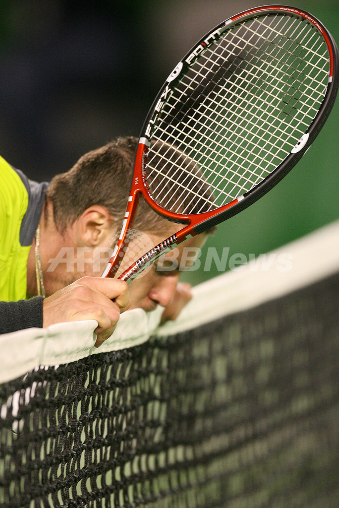写真は、ポイントを奪われラケットを放り投げるサフィン。(c)AFP/DEAN TREML