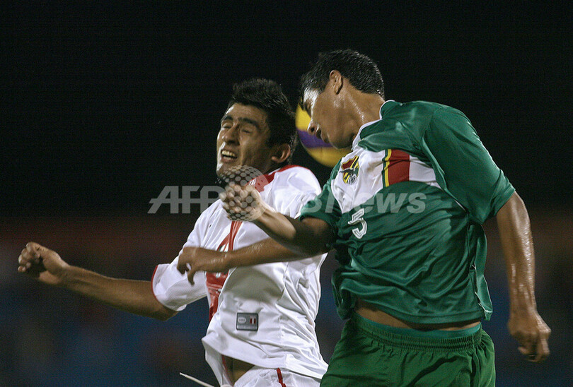 【ペドロフアンカバイェロ/パラグアイ 15日 AFP】サッカー、南米ユース選手権(2007 South American Youth Championship)・グループA、ペルーvsボリビア。ボリビアのエドゥアルド・フィエロ(Eduardo Fierro)は、後半33分にダメ押しとなるチーム4点目のゴールを決める。試合はボリビアが4-1でペルーに快勝してグループリーグ初白星を挙げ、通算成績を1勝2敗1分けとした。写真は、ペルーのヘクソン・レイェス(Jeckson Reyes)とヘッドでボールを競り合うフィエロ(左)。(c)AFP/Norberto DUARTE