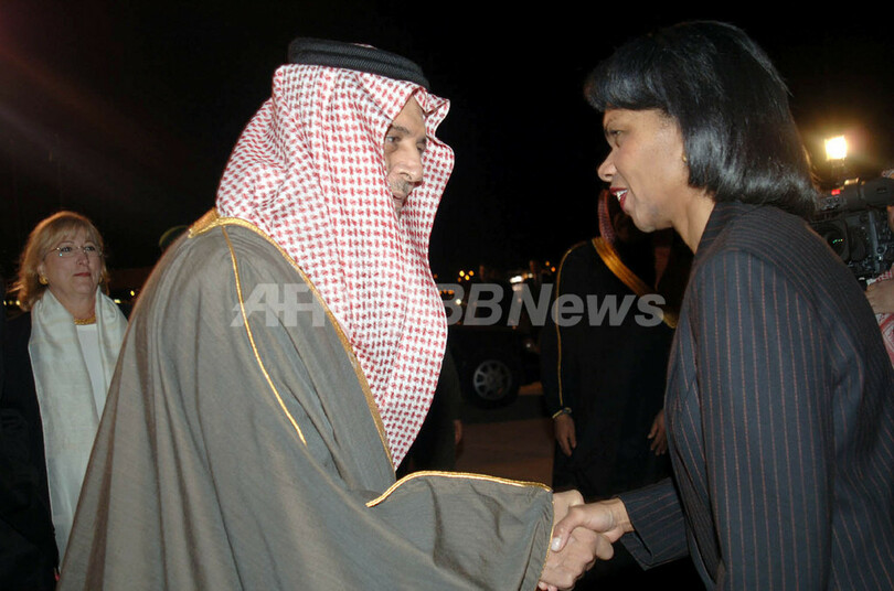 写真は15日深夜、リヤド(Riyadh)空港に到着したライス米国務長官を歓迎するサウジアラビアのサウド・ファイサル(Saud al-Faisal)外相(左から2人目)(c)AFP