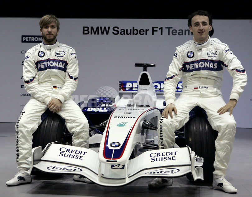 【バレンシア/スペイン 16日 AFP】F1に参戦するBMWザウバー(BMW Sauber)は16日、2007年シーズンのニューマシン「F1.07」を発表した。この発表記者会見には、ドライバーを務めるニック・ハイドフェルド(Nick Heidfeld、左)やロベルト・クビサ(Robert Kubica)が出席し、ニューマシンと共に記念撮影を行った。(c)AFP/JOSE JORDAN