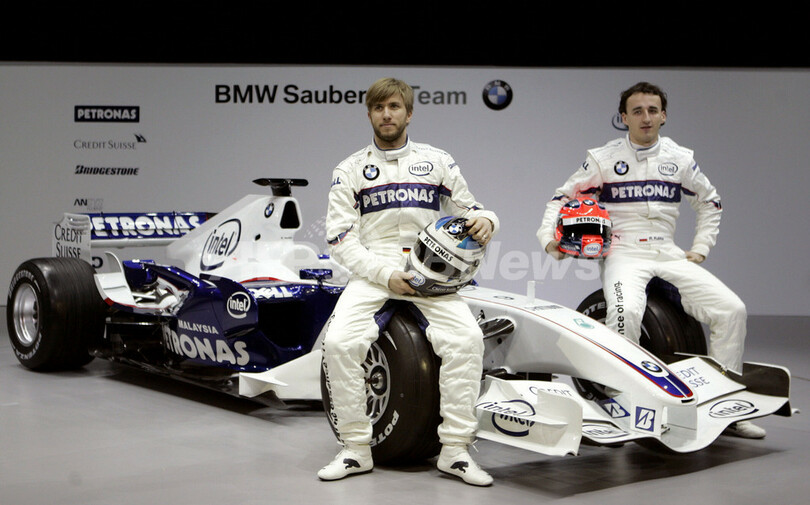 【バレンシア/スペイン 16日 AFP】F1に参戦するBMWザウバー(BMW Sauber)は16日、2007年シーズンのニューマシン「F1.07」を発表した。この発表記者会見には、ドライバーを務めるニック・ハイドフェルド(Nick Heidfeld、左)やロベルト・クビサ(Robert Kubica)が出席し、ニューマシンと共に記念撮影を行った。(c)AFP/JOSE JORDAN