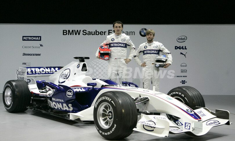 【バレンシア/スペイン 16日 AFP】F1に参戦するBMWザウバー(BMW Sauber)は16日、2007年シーズンのニューマシン「F1.07」を発表した。この発表記者会見には、ドライバーを務めるニック・ハイドフェルド(Nick Heidfeld、左)やロベルト・クビサ(Robert Kubica)が出席し、ニューマシンと共に記念撮影を行った。(c)AFP/JOSE JORDAN