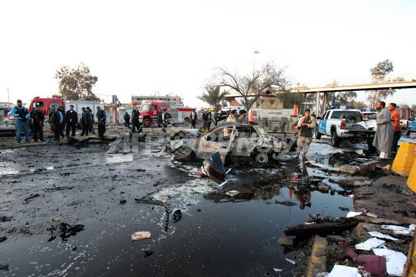 写真は同日、爆発した車両の周りに集まる人々。(c)AFP/ALI AL-SAADI