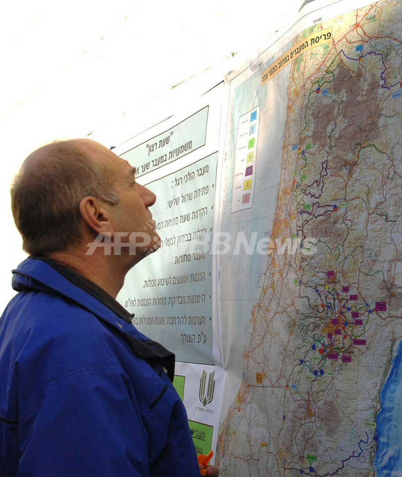 【エルサレム/イスラエル 17日 AFP】法務省は16日、レウミ(Leumi)銀行民営化の際にエフド・オルメルト(Ehud Olmert)首相がかかわったとされる不正疑惑に基づき、首相に対する捜査を開始したと伝えた。検察当局が警察機関に対し、捜査開始を命じたという。オルメルト首相は2004年財務相在任中にイスラエル第2位のレウミ銀行民営化の際、同銀行の株式売買に関連しインサイダー取引を行なったとの嫌疑をかけられている。写真は同日、ヨルダン川西岸の町トルカレム(Tulkarem)で、パレスチナ自治区近郊の国境地域Ephraimを訪れ地図を見るオルメルト首相。(c)AFP/MOSHE MILNER