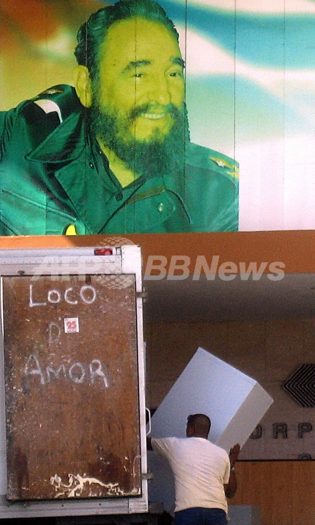 写真はハバナ(Havana)で同日、カストロ議長の巨大なポスターの前で大型トラックから積み荷を降ろす労働者。(c)AFP/JUAN CARLOS BORJAS