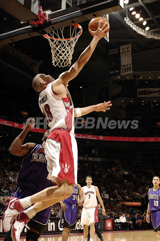 【トロント/カナダ 17日 AFP】06-07NBA、トロント・ラプターズ(Toronto Raptors)vsサクラメント・キングス(Sacramento Kings)。ラプターズのモーリス・ピーターソン(Morris Peterson)は、ベンチスタートながらゲームハイの22得点を記録する活躍でチームを勝利に貢献。試合は最大16点のリードを奪ったラプターズが101-85でキングスを降し、連勝で今季19勝目を挙げた。写真は、キングスのブラッド・ミラー(Brad Miller、左)にマークされながらもカットインを試みるピーターソン。(c)AFP/Getty Images Ron Turenne